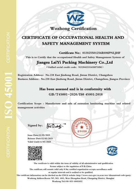 Стандартный:CERTIFICATE OF OCCUPATIONAL HEALTH ANDSAFETY MANAGEMENT SYSTEM Число:033825S01256ROMPNLHF Дата выпуска:2025-05-12 Дата истечения:2028-05-11