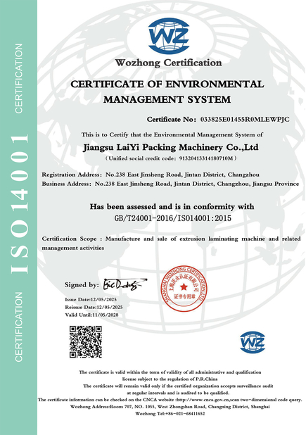 Стандартный:CERTIFICATE OF ENVIRONMENTAL MANAGEMENT SYSTEM Число:033825E01455ROMLEWPIC Дата выпуска:2025-05-12 Дата истечения:2028-05-11